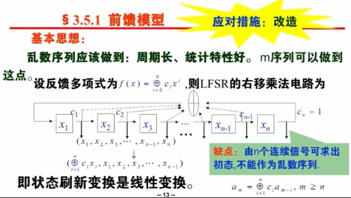 改造即为初始乱源(一个/多个线性反馈移存器或非线性~),加上关于密钥 的非线性变换 。