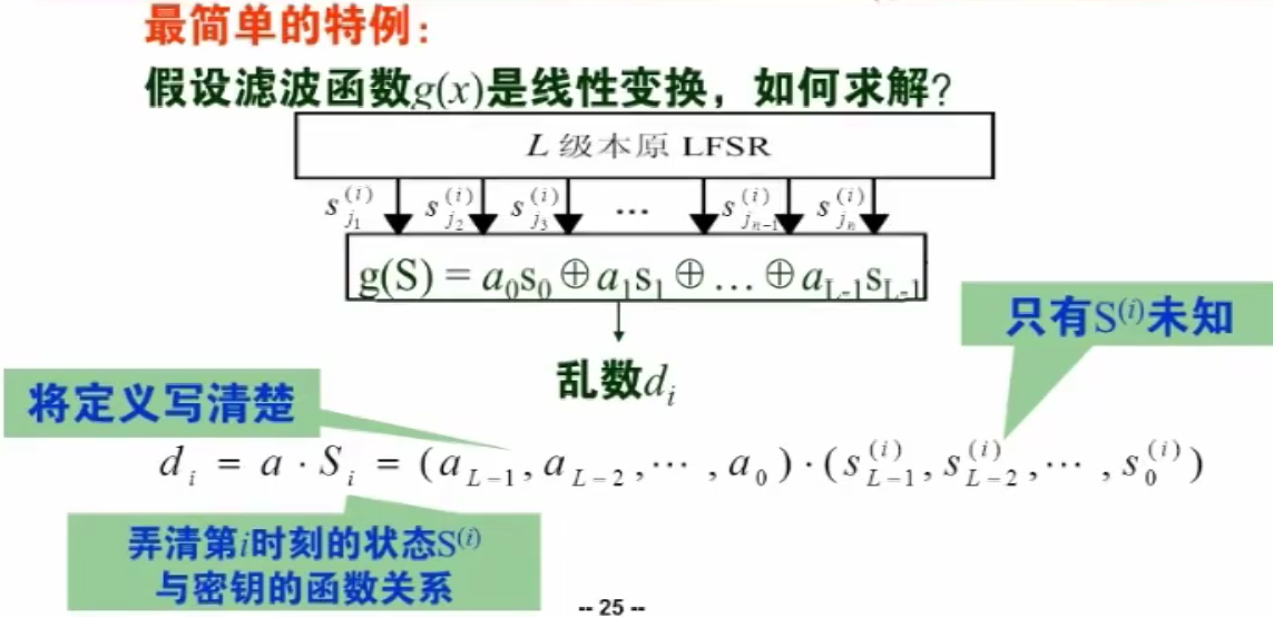 设非线性滤波模型由一个级数为 的本源 LFSR 和一个次数为 的非线性 Boole 函数 组成,其中 与密钥无关,则有:
