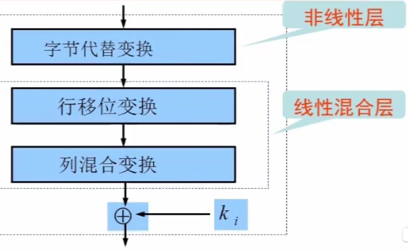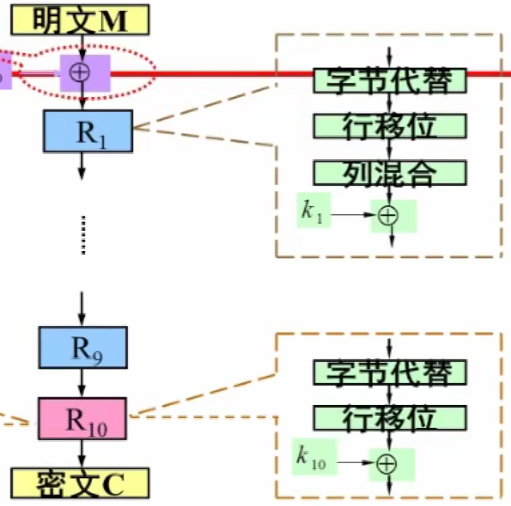 以 128 为例。最开始与原密钥 ,经过 9 轮圈函数,第 10 轮即出口处理变换。