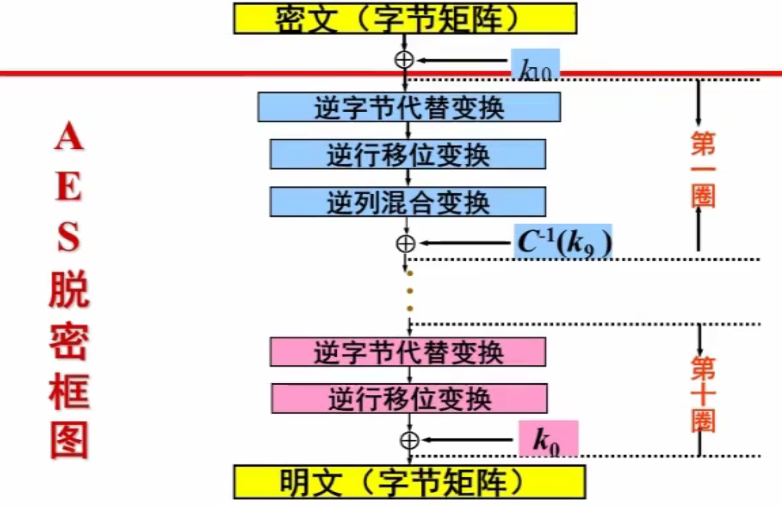 除圈密钥加不再是对合变换了,故解密过程都采用逆变换。