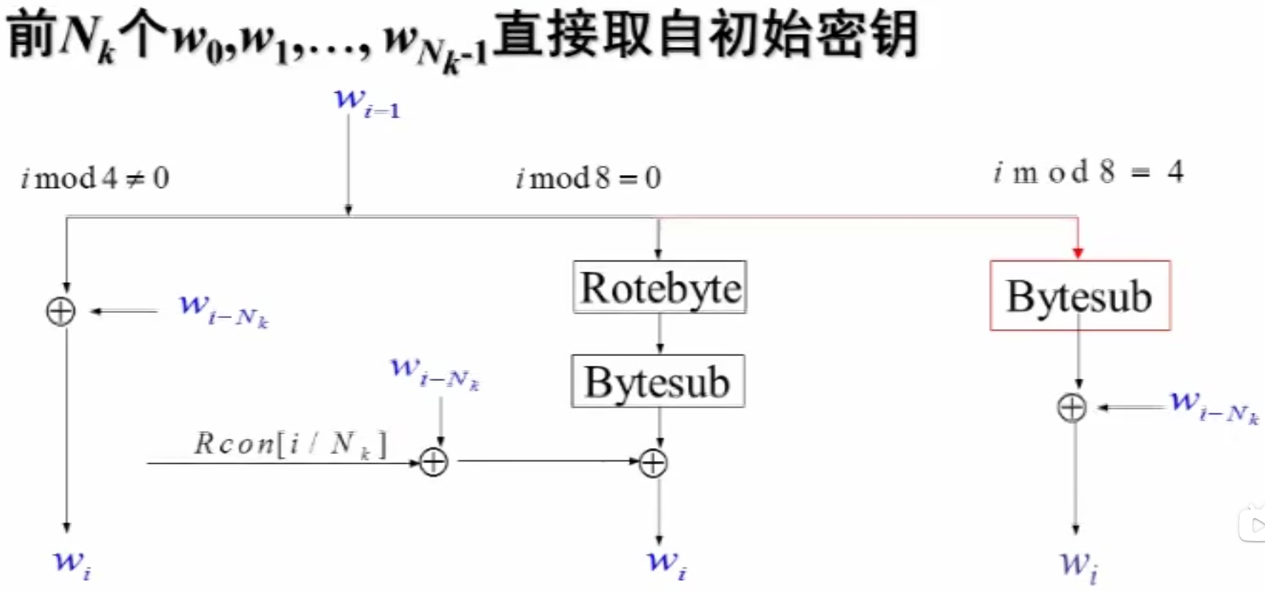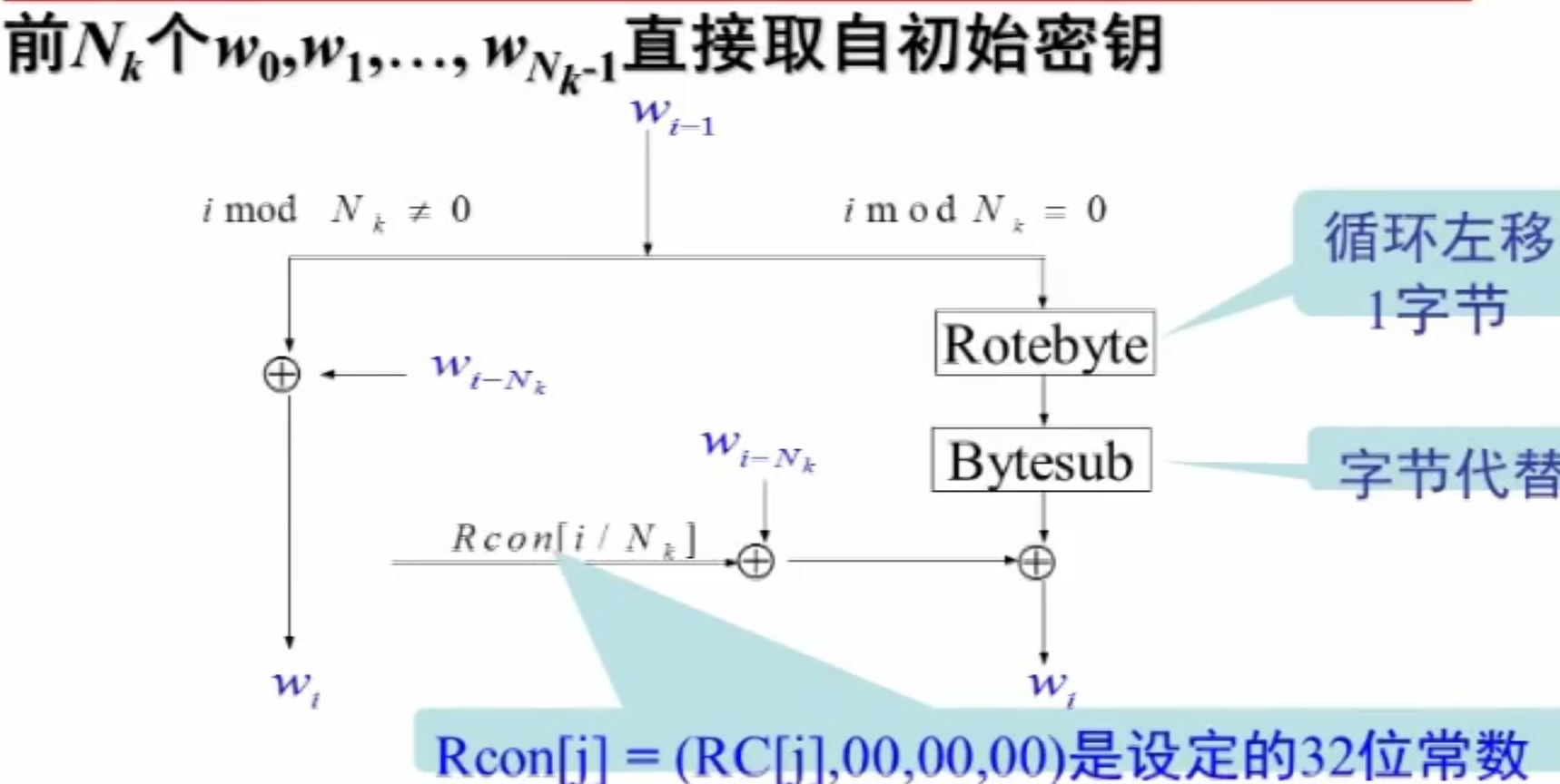 设有 个初始密钥(例如 128 位时,),前 个直接取初始密钥;