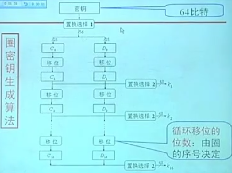 置换选择2:从56 位,即两个 28 位中选 24 + 24 = 48 位,即为圈密钥。